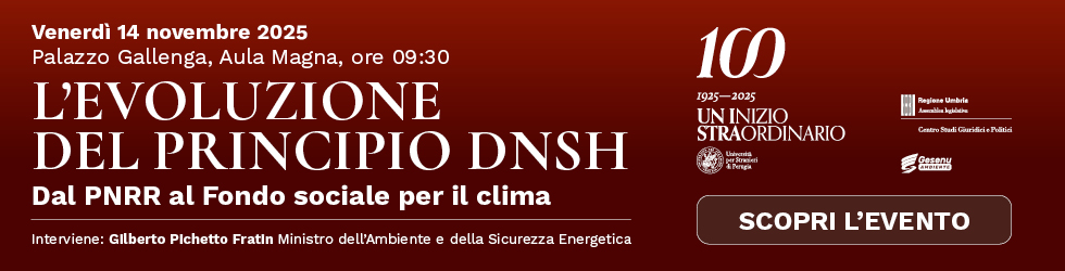 13:30 Pausa pranzo (Palazzo Gallenga, Sala Goldoni)14:30 “LE RESPONSABILITÀ NELL’APPLICAZIONE DEL PNRR E DEL PRINCIPIO DNSH”Saluto introduttivo:Pierfrancesco Ungari - Presidente del TAR Umbria